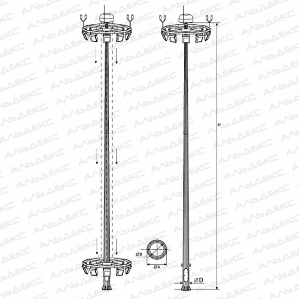 Фланец: Диаметр окружности высокомачтовой опоры освещения ВМО-20-В — сложные конструкции высотой 20 м, снабжаемые мобильной короной, дополнительной системой, посредством которой осуществляется фиксация светотехнического оборудования и которая при необходимости может быть приближена к земле всего одним работником. Изделия рассчитаны на достаточно большие боковые и вертикальные нагрузки, однако их монтаж допускается лишь в тех районах, степень ветрового воздействия в которых не превышает VII степени. При соблюдении всех условий эксплуатации изделия могут прослужить около