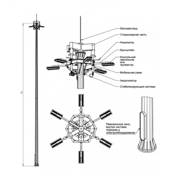 Высота высокомачтовых опор МГФ 16 метров. Их грузоподъёмность составляет 250 кг. Количество прожекторов в каждой опоре — до 6 штук.